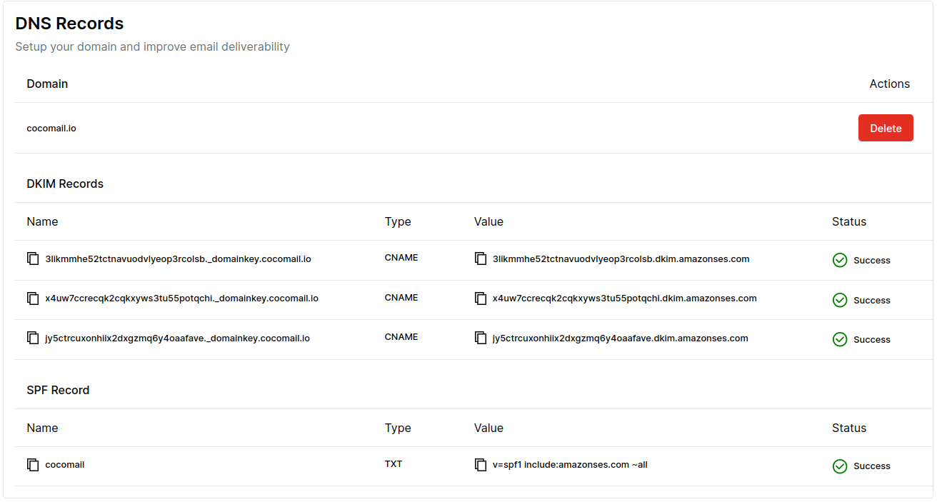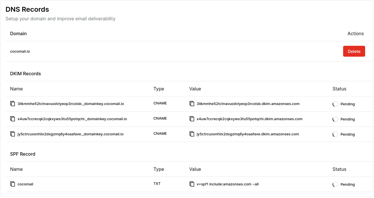 After entering your domain you'll be provided with DKIM and SPF records. These records are used to help protect senders and recipients from spam, spoofing, and phishing. Setting up the records correctly also reduces the risk of your emails ending up in the spam folder. For more information about DKIM and SPF, head over to the Knowledge Center.